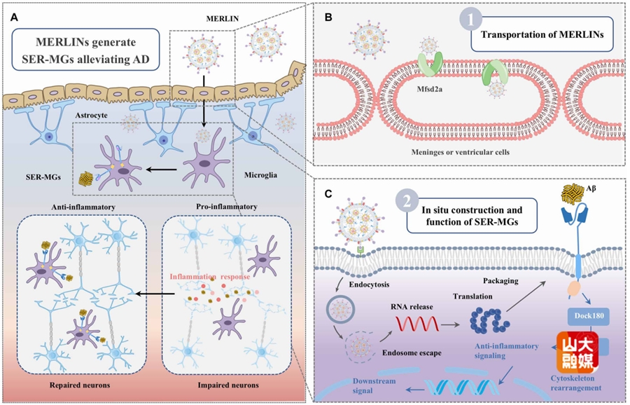 靶向清除淀粉样蛋白β(Aβ)的单克隆抗体免疫治疗在阿尔茨海默病研究中备受关注,但其伴随的Fc受体激活及促炎效应可加剧神经元损伤。为解决这一难题,本研究创新性地构建了一种合成吞噬凋亡受体(SER),其整合了针对Aβ的单链可变片段抗体、基于TIM4的吞噬受体框架以及用于小胶质细胞(MG)重编程的下游信号模块,从而实现选择性清除Aβ而不诱导炎症反应。具体而言,本研究开发了自主设计的小胶质细胞编辑型mRNA脂质纳米颗粒(MERLINs),可高效递送SER mRNA至小胶质细胞,使其在体内原位生成Aβ特异性的SER-MG。体外实验显示,SER-MG具备强效的Aβ特异性吞噬能力,并激活典型的抗炎性吞噬凋亡信号通路。在阿尔茨海默病小鼠模型中,SER在MG中的表达显著增强了Aβ清除效率,抑制了炎症反应,从而改善了行为学表现,并显著减少了突触丢失。研究结果表明,通过SER实现阿尔茨海默病相关异常小胶质细胞的抗炎性重编程,可在体内促进Aβ的高效清除,并展现出在其他炎症相关疾病中拓展应用的潜力。该研究成果近日发表于Science Advances,齐鲁医院神经外科倪石磊、张玉霖,药学院姜新义、陈晨为共同通讯作者;第一临床学院本科生张毅、药学院研究生杨贞梅为共同第一作者。