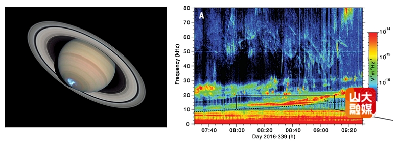左图:哈勃太空望远镜拍摄的土星极光照片(图片来源:NASA, ESA, J. Clarke and Z. Levay)。中图:Cassini观测到的土星千米波辐射(Lamy et al. 2018)。右图:2008年4月1日Cassini-RPWS穿越土星20 kHz窄带辐射源区时的频谱图(Ye et al. 2009)。