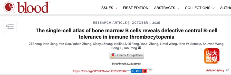 [本站讯]近日,山东大学齐鲁医院彭军、李松和王姝文团队在国际血液学顶刊Blood(中科院一区Top,IF = 23.1)杂志发表了题为The single-cell atlas of bone marrow B cells reveals defective central B-cell tolerance in immune thrombocytopenia的研究论文。本研究系统描绘了免疫性血小板减少症(ITP)患者骨髓B细胞的全景图谱,揭示了中枢B细胞耐受缺陷的关键分子机制。山东大学齐鲁医院教授彭军、副教授李松、副研究员王姝文为共同通讯作者,齐鲁医院绳紫、姜楠、高岩(现淄博市中心医院)为共同第一作者,山东大学齐鲁医院为第一作者和通讯作者单位。