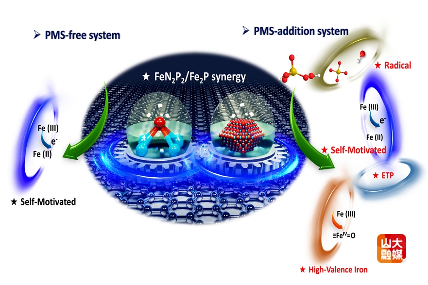 单原子/纳米团簇复合催化剂在类芬顿氧化体系中极具普适性,是一种高效、可靠的催化策略。但是,纳米团簇与单原子作为共存富电子中心在零氧化剂添加的“自驱动”类芬顿催化中的协同作用机制尚不明确。团队成功研发了一种由Fe2P纳米团簇与铁单原子(FeN2P2/C)共存组成的复合催化剂及其催化装置,并将其应用于两种催化体系:零过一硫酸盐(PMS)添加体系和低PMS添加体系。结果表明,具有缺电子区域的Fe2P/FeN2P2/C催化剂可通过π–π键吸附污染物,并将电子从污染物提取至作为电子受体的单原子FeN2P2/C位点。这一自驱动过程通过Fe2P纳米团簇的动态协同效应进行调控。该催化剂在“零PMS”和“低PMS”两种模式下均表现出色。无PMS时依托上述自驱动机制实现污染物的快速去除;而在添加PMS时,则同时启动多路径活化PMS的过程,形成双重催化效应。