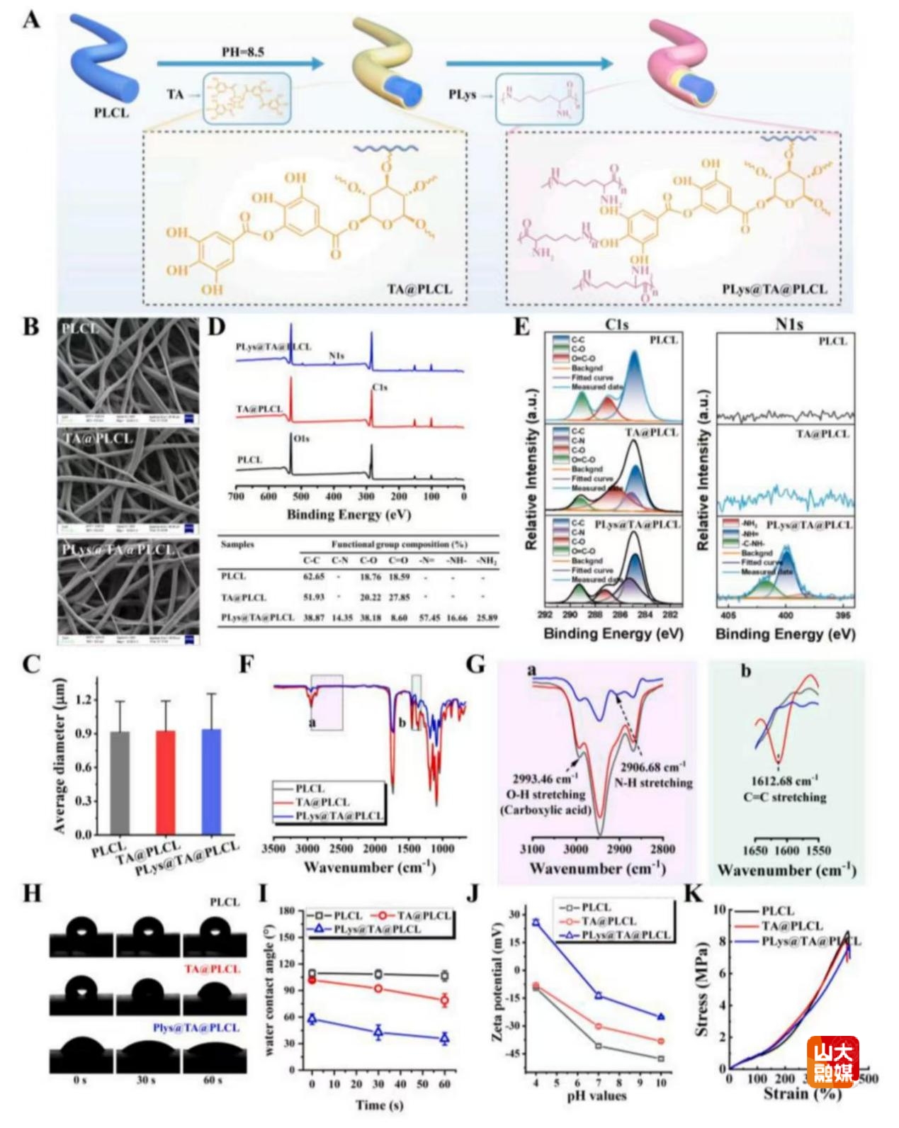 [本站讯]近日,山东大学齐鲁医院(青岛)整形美容科主任赵海光教授团队在Materials Today Bio(中科院1区Top期刊,IF:10.2)上发表题为“Nanofibrous dressings incorporating a synergistic antibacterial-anti-inflammatory effect for infected wound healing”的研究成果。该研究报道了一种新型纳米纤维敷料(PLys@TA@PLCL)通过整合电纺纳米纤维的物理屏障特性、生物大分子聚赖氨酸(PLys)的抗菌活性以及天然大分子单宁酸(TA)的抗炎抗氧化作用实现抗菌-抗炎的协同效应。