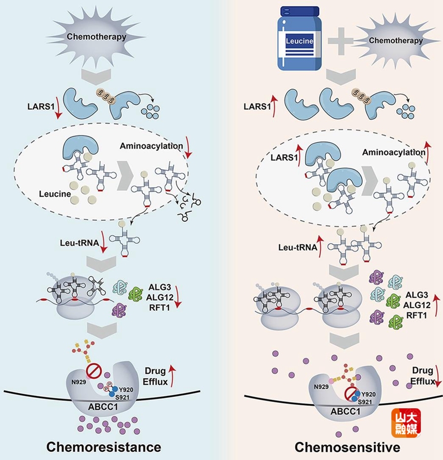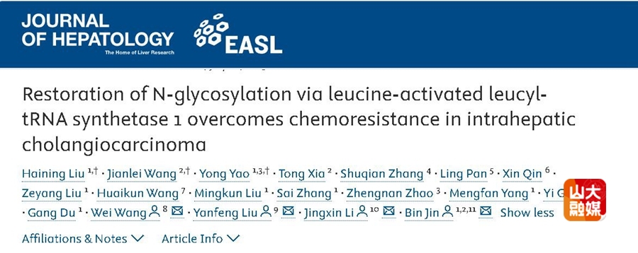 [本站讯]近日,山东大学齐鲁第二医院靳斌教授团队与李景新教授团队在欧洲肝脏研究学会(EASL)的官方旗舰期刊Journal of Hepatology(中科院1区TOP期刊,IF:33)在线发表了最新研究成果“Restoration of N-glycosylation via leucine-activated leucyl-tRNA synthetase 1 overcomes chemoresistance in intrahepatic cholangiocarcinoma”。该研究阐明了亮氨酸驱动的亮氨酰-tRNA合成酶1(leucyl-tRNA synthetase 1,LARS1)通过选择性翻译上调N-糖基化水平,增敏肝内胆管癌(Intrahepatic Cholangiocarcinoma, ICC)化疗疗效的机制,为改善ICC化疗抵抗提出治疗新策略。