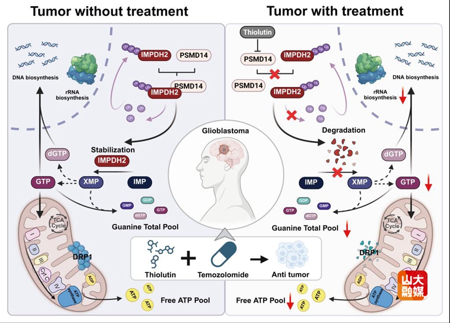 胶质母细胞瘤(GBM)蛋白质稳态失衡,而蛋白稳态与代谢重编程的协同作用尚未充分阐明。研究发现,PSMD14在GBM组织中表达显著升高,且与患者不良预后相关。机制上,PSMD14通过特异性去除嘌呤合成限速酶IMPDH2的K48连接泛素化修饰,维持其蛋白稳定性,保障细胞内GTP的持续供应,进而促进核苷酸从头合成与线粒体能量代谢,最终驱动肿瘤进展并诱导化疗耐药。PSMD14介导的这一调控轴在功能上实现了蛋白稳态与核苷酸代谢的耦联,靶向PSMD14有望实现对GBM生存依赖的双重打击。进一步,PSMD14抑制剂硫藤黄素能够干扰上述代谢通路,抑制肿瘤生长并延长生存期,与替莫唑胺TMZ协同发挥抗肿瘤效应,为同时靶向肿瘤的蛋白质稳态与核苷酸代谢提供了新策略。