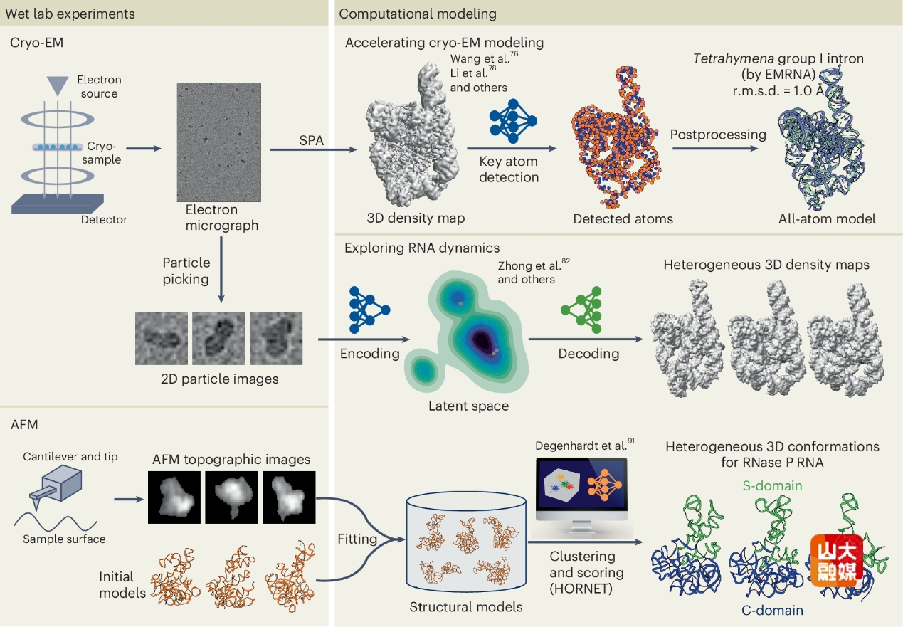 [本站讯]近日,山东大学数学与交叉科学研究中心、教育部非线性期望前沿科学中心杨建益教授团队在生物学权威期刊Nature Biotechnology(IF:41.7)发表题为“Integrated experimental and AI innovations for RNA structure determination”的观点(Perspective)文章。该文章系统性回顾了RNA结构测定领域的最新革命性进展,深刻剖析了实验技术与人工智能(AI)从“并行发展”走向“深度融合”的变革趋势,并为解析RNA世界的复杂性提供了前瞻性的路线图。数学与交叉科学研究中心博士后王文恺、博士研究生苏宝泉为论文共同第一作者,杨建益教授、彭珍玲教授为共同通讯作者,山东大学数学与交叉科学研究中心为唯一完成单位。