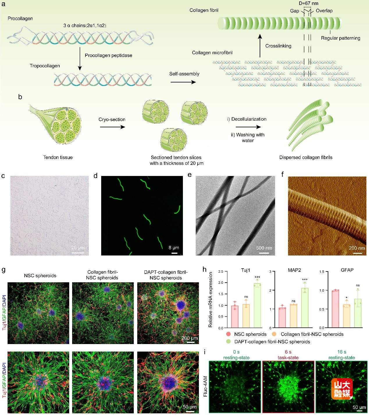 脊髓损伤修复是再生医学领域的重大挑战。基于神经干细胞的三维球体移植因其能模拟细胞间的相互作用而被视为一种有前景的治疗策略,但球体内缺乏天然的细胞外基质-细胞相互作用,易形成缺氧坏死核心,且难以实现神经干细胞向功能神经元的定向分化。针对上述问题,研究团队创新性地通过冷冻切片与脱细胞处理,制备出具有完整周期性条带和三螺旋结构的均匀胶原微纤维。这些胶原微纤维可作为天然细胞外基质,与神经干细胞自组装形成工程化的干细胞球体。在球体内部,胶原微纤维均匀分布形成网络结构,有效缓解内部缺氧、增强细胞外基质-细胞相互作用,显著提升神经干细胞存活率与增殖能力。更重要的是,该胶原微纤维可作为分化诱导剂的储库,实现药物在神经干细胞球体内部的缓释与精准递送,成功引导神经干细胞高效分化为成熟的神经元,并形成具有功能性的神经微组织。在脊髓损伤小鼠模型中,移植该工程化干细胞球体显著促进了损伤区域神经元的再生、减少了胶质瘢痕形成,并有效改善了小鼠的运动功能恢复。本研究为构建神经微组织及治疗脊髓损伤等中枢神经系统疾病提供了全新的材料平台与治疗策略。
