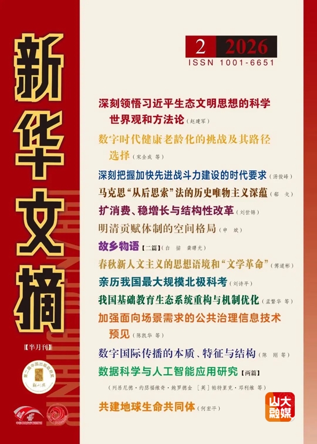 [本站讯]近日,《新华文摘》2026年第2期封面重点推荐并全文转载了哲学与社会发展学院教授宋全成与2022级社会学专业博士研究生张倩的题为《数字时代健康老龄化的挑战及其路径选择》的论文,原文发表于《济南大学学报》(社会科学版)2025年第4期。