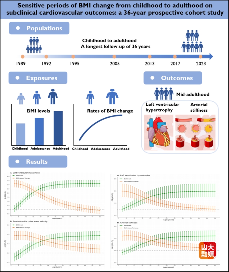 研究二:“Sensitive periods of BMI change from childhood to adulthood on subclinical cardiovascular outcomes: a 36-year prospective cohort study”。该研究重点探索儿童期到成年期BMI变化轨迹与中年期亚临床心血管结局之间的关联。山东大学公共卫生学院博士研究生杨慧、刘姿琪及西安交通大学第一附属医院郭统帅主治医师为该论文共同第一作者;山东大学公共卫生学院席波教授、西安交通大学第一附属医院牟建军教授为共同通讯作者。
