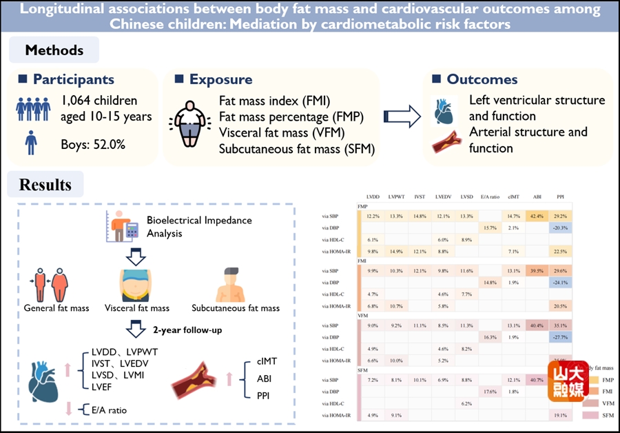 研究一:“Longitudinal associations between body fat mass and cardiovascular outcomes among Chinese children: mediation by cardiometabolic risk factors”。该研究聚焦儿童期体脂肪量与心血管结构功能之间的关联及潜在机制。山东大学公共卫生学院博士研究生杨慧为该论文第一作者,山东大学公共卫生学院席波教授为通讯作者,山东大学为第一作者和通讯作者单位。