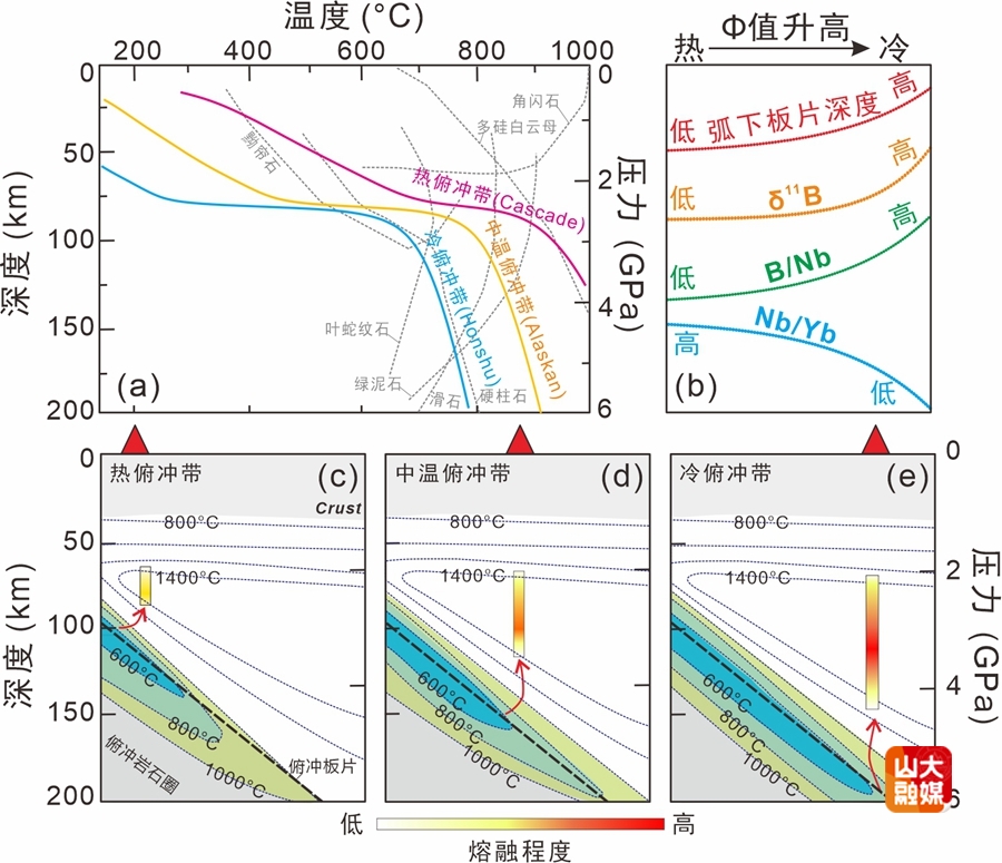 图2.模型图显示俯冲板片脱水作用与地幔楔熔融过程及火山弧形成位置的差异性和内在联系。