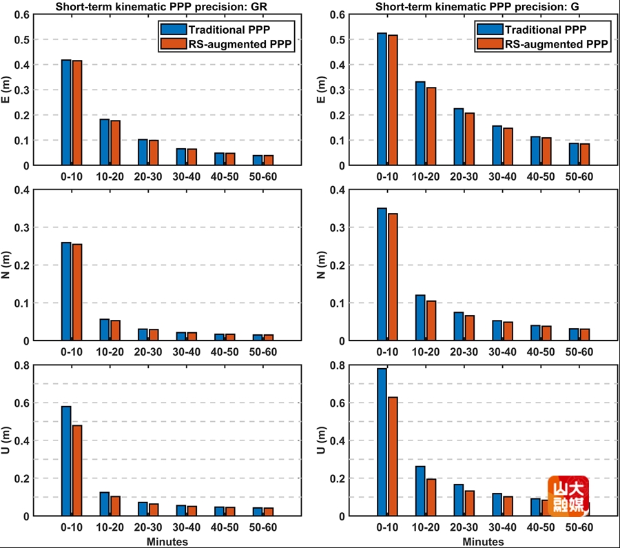 在此基础上,团队进一步引入广义回归神经网络(GRNN)与随机森林(RF)等机器学习算法,从空间和时间双重维度对遥感水汽产品进行精度优化。以空间维度为例,经GRNN优化后的可降水汽(PWV)产品RMSE由2.89 mm显著降低至2.16 mm。利用改进后的PWV产品进行ZTD反演并应用于PPP,定位精度与收敛时间分别提升了29.8%和31.4%。