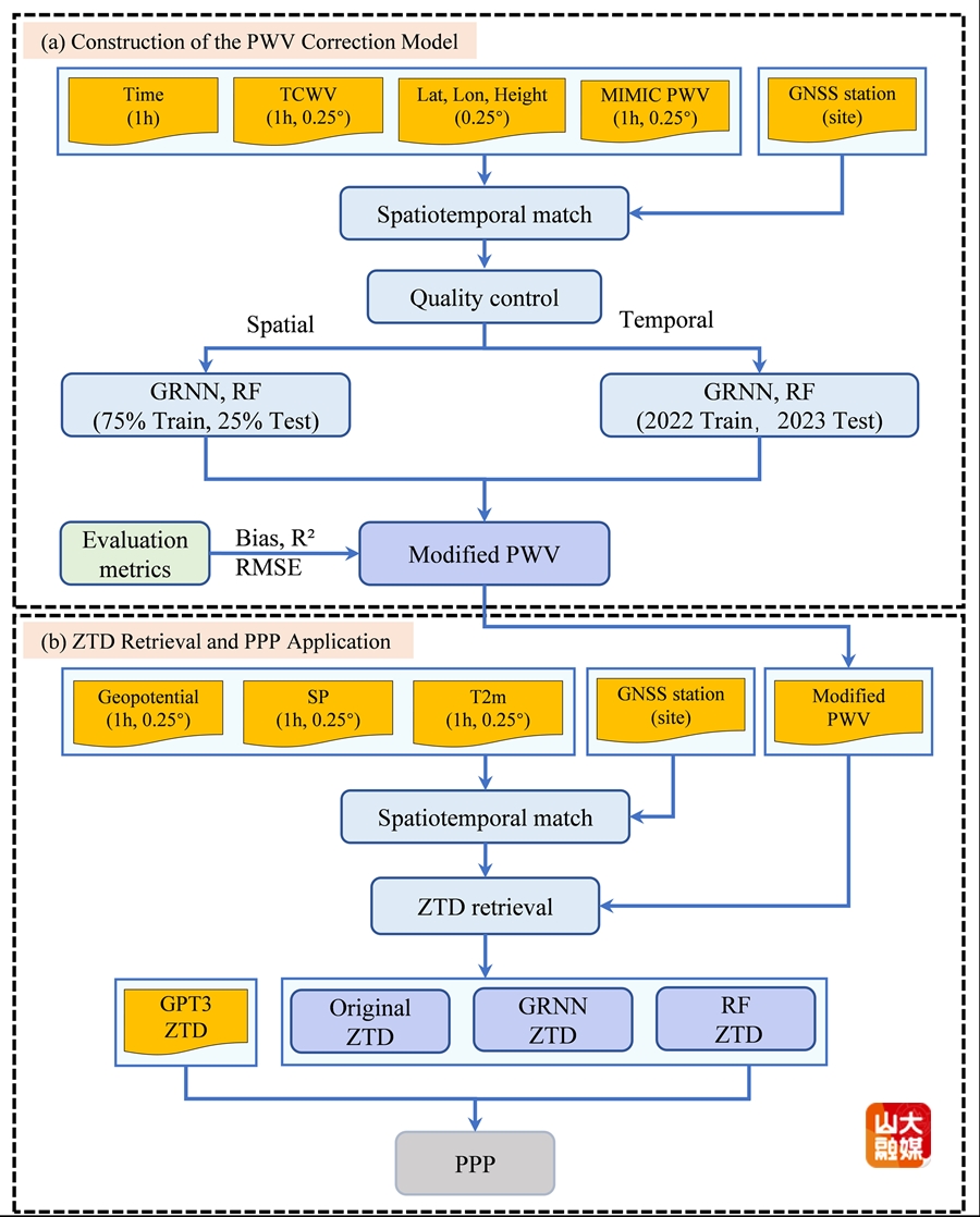 该研究表明,通过融合遥感水汽产品与机器学习方法,可有效提升遥感水汽产品精度,进而显著改善GNSS PPP的定位效能。相关成果不仅为遥感水汽产品在精密定位领域的应用提供了新思路,也为极端天气过程中的水汽变化研究提供了重要的数据支撑。