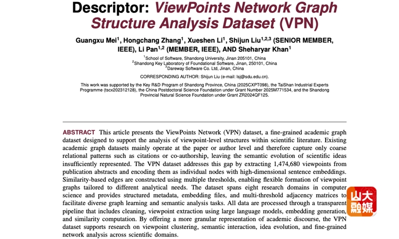 [本站讯]近日,软件学院智能服务研究团队在IEEE Data Descriptions发布细粒度学术观点网络数据集(ViewPoints Network, VPN)。该数据集首次从观点层级构建计算机科学领域的学术网络,突破传统学术网络数据集停留在论文或作者层级的粗粒度局限,为科学思想语义演化分析、图结构学习研究提供了高质量数据支撑。