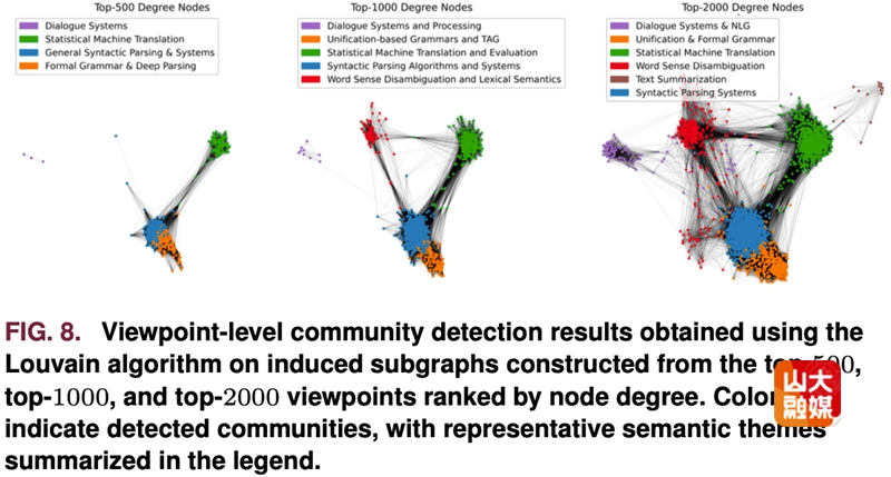 为验证数据集的分析优势,团队在计算语言学领域开展观点层级社区发现实验。基于节点度数排名前500、1000和2000的观点节点构建导出子图,通过 Louvain 算法实现的社区划分,精准对应对话系统、统计机器翻译等连贯语义主题,且主题间呈现出有意义的重叠与桥接观点。与传统论文层级聚类不同,VPN 数据集支持同一篇论文的不同概念性贡献参与不同语义社区,实现了学术观点的精细化聚类,为解析学术思想的组织方式与演化路径提供了更微观精准的研究视角。