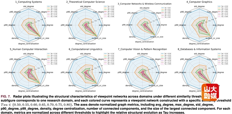 为适配多样化的分析需求,团队通过高维嵌入将每个观点编码为独立节点,并依据观点间嵌入的不同相似度阈值,构建多个学术观点图。具体设置0.50至0.80共7个梯度的语义相似度阈值,为各研究领域分别构建观点网络,网络节点代表观点向量嵌入,边则表征特定阈值下观点间的语义相似性。此外,数据集提供了每个观点的详细元数据,包括原始句子、文献标题、作者、发表年份、发表场所以及参考文献,为研究提供完整的数据支撑。