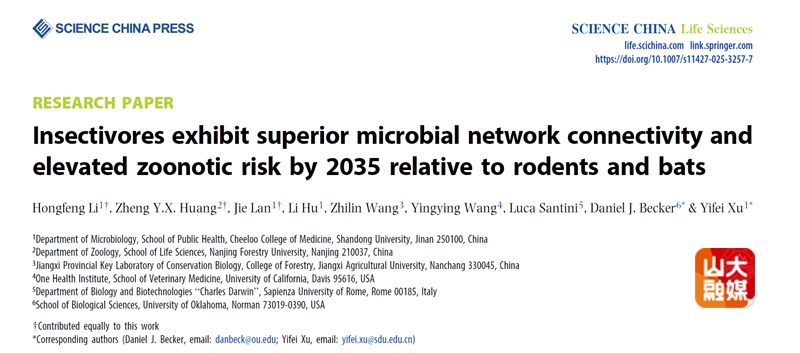 [本站讯]近日,公共卫生学院许一菲教授团队在Science China Life Sciences(《中国科学:生命科学》英文版)在线发表了题为“Insectivores exhibit superior microbial network connectivity and elevated zoonotic risk by 2035 relative to rodents and bats”的研究论文,系统比较了食虫类、啮齿类与蝙蝠三大类群小型哺乳动物的微生物多样性和跨种传播潜力,揭示食虫类动物在疫病生态系统中扮演着被低估的重要角色,为野生动物疫病监测和风险评估提供了新的视角。