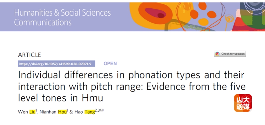 [本站讯]近日,文学院副教授刘文在Nature旗下人文社科期刊Humanities & Social Sciences Communications发表论文“Individual differences in phonation types and their interaction with pitch range: Evidence from the five level tones in Hmu”(《嗓音发声类型的个体变异及其与音高的互动关系:来自苗语五平调的证据》)。刘文副教授为该文的第一作者,文学院硕士研究生侯念含为第二作者,江苏师范大学语言科学与艺术学院副教授唐浩为通讯作者,山东大学文学院为第一单位。