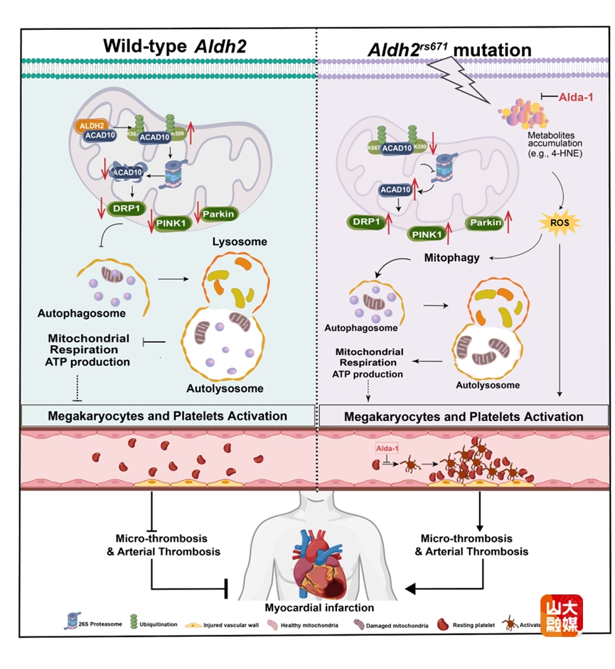 研究团队首先培育了ALDH2E506K点突变小鼠和血小板Aldh2条敲小鼠,构建肠系膜动脉血栓模型,利用体式荧光显微镜实时观察动脉血栓形成并记录小鼠动脉血栓闭塞时间、血栓生长速率、尾静脉出血时间等,以及利用流式、血小板铺展实验和凝块回缩等实验检测血小板活化功能指标,发现Aldh2基因变异和表达缺失能促进血小板过度活化和加剧动脉血栓形成。研究团队为进一步阐明ALDH2功能障碍导致血小板活化的机制,通过蛋白质组学、质谱分析和分子生物学等技术和实验,不仅发现了Aldh2基因变异和表达缺失通过促进毒性醛和活性氧蓄积导致血小板过度活化,而且揭示了Aldh2基因变异和表达缺失导致血小板过度活化加剧动脉血栓形成是通过抑制ACAD10 K567/K599位点泛素化促进其线粒体自噬实现的。