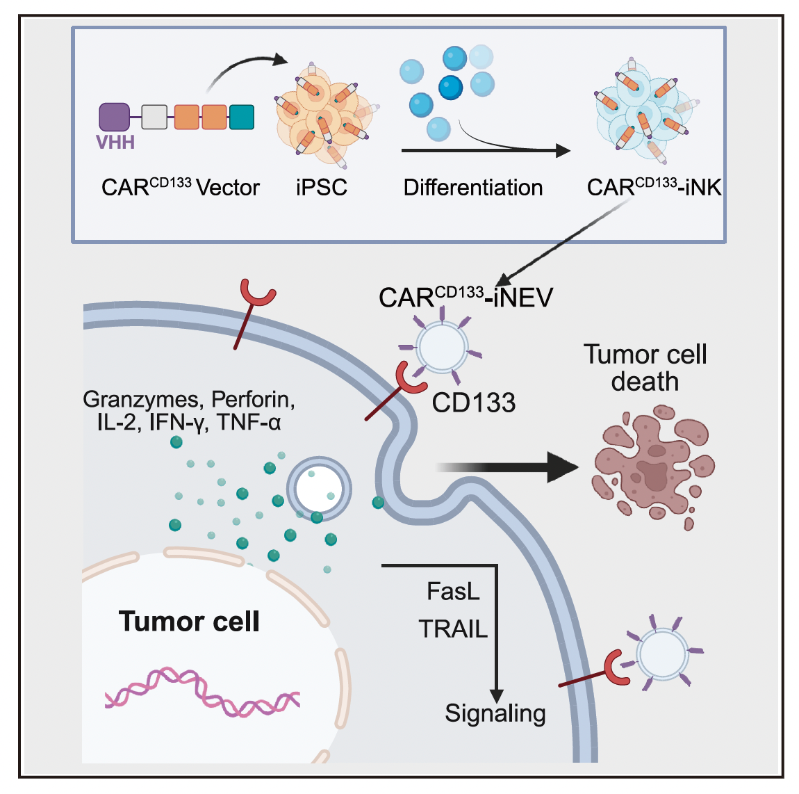 该研究针对实体瘤治疗中普遍存在的基质屏障强、免疫抑制微环境明显、效应细胞浸润不足等难题,构建了一种基于诱导多能干细胞来源 CAR-NK细胞外囊泡的无细胞治疗平台(CAR-iNEV)。摘要显示,这一策略在多种异种移植瘤及患者来源模型中表现出显著的抗肿瘤活性和良好的耐受性;在机制上,CAR-iNEV不仅能够直接杀伤肿瘤细胞,还可通过促进巨噬细胞向促炎表型极化,重塑肿瘤免疫微环境,进而增强宿主先天抗肿瘤免疫。进一步地,该研究还发现CAR-iNEV与免疫检查点阻断具有协同作用,与CD47抑制联合后可进一步提升肿瘤清除效果,并在存活小鼠中诱导长期免疫记忆,提示其在实体瘤治疗中具有较好的转化潜力。