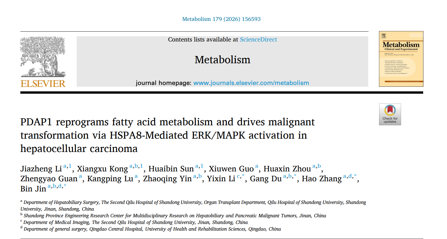 另一项发表于Metabolism的论文题目为“PDAP1 reprograms fatty acid metabolism and drives malignant transformation via HSPA8-mediated ERK/MAPK activation in hepatocellular carcinoma”。靳斌教授,山东大学齐鲁第二医院教授李轶忻,山东大学齐鲁医院教授杜刚、齐鲁医院张浩为共同通讯作者;山东大学齐鲁第二医院博士研究生李嘉正、孔祥旭,山东大学齐鲁医院教授孙怀斌为该文章共同第一作者。