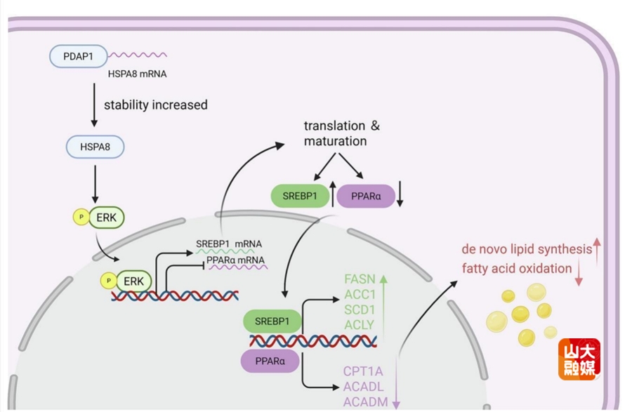 肝细胞癌是严重威胁人民健康的常见恶性肿瘤之一,其发生发展与代谢重编程密切相关。该研究围绕PDAP1在肝细胞癌中的作用展开,结果显示,PDAP1在肝细胞癌中显著上调,并与患者较差的总生存和无进展生存相关。功能实验表明,抑制PDAP1可降低肝癌细胞增殖、迁移和侵袭能力并促进细胞凋亡,而过表达PDAP1则产生相反效应;在体内模型中,PDAP1 同样表现出促进肿瘤生长和转移的作用。机制上,研究发现 PDAP1作为RNA结合蛋白可稳定HSPA8 mRNA,进而激活ERK/MAPK信号通路,增强SREBP1介导的脂肪酸合成、抑制PPARα驱动的脂肪酸氧化,最终推动肝细胞癌脂肪酸代谢重编程及恶性进展。该成果为理解肝癌代谢异常提供了新的分子依据,也提示PDAP1可能成为肝细胞癌治疗的潜在靶点。