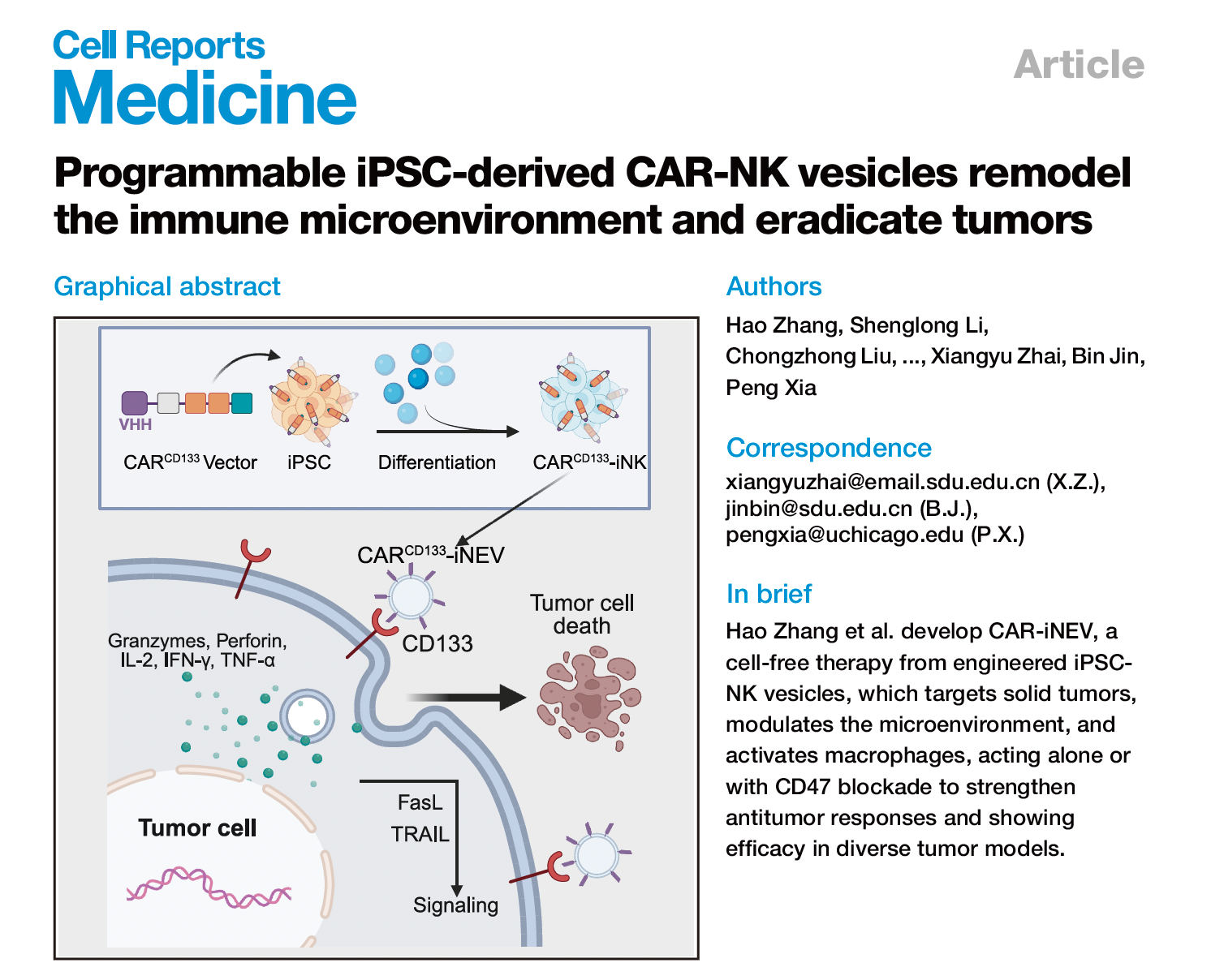 其中,发表于Cell Reports Medicine的论文题目为“Programmable iPSC-derived CAR-NK vesicles remodel the immune microenvironment and eradicate tumors”,靳斌教授、山东大学齐鲁第二医院主治医师翟翔宇、芝加哥大学教授夏鹏为共同通讯作者;山东大学齐鲁第二医院教授刘崇忠、山东大学齐鲁医院肝脏移植科张浩、大连理工大学附属肿瘤医院教授李盛龙为该文章共同第一作者。