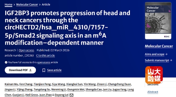 [本站讯]近日,山东大学齐鲁医院雷大鹏教授团队在Molecular Cancer(中科院一区Top/JCR Q1,五年IF:35.9)在线发表最新研究成果“IGF2BP3 promotes progression of head and neck cancers through the circHECTD2/hsa_miR_4310/7157-5p/Smad2 signaling axis in an m6A modification-dependent manner”。该研究揭示IGF2BP3可以通过M6A依赖的方式通过circHECTD2/hsa_miR_4310/7157-5p/Smad2信号轴调控头颈鳞癌进展,为头颈鳞癌的预后评估和靶向治疗提供了全新的生物标志物和潜在治疗靶点。耳鼻咽喉科主任、国家卫健委耳鼻喉科学重点实验室常务副主任雷大鹏为通讯作者,山东大学齐鲁医院博士研究生武凯楠、助理研究员常芬为共同第一作者,山东大学齐鲁医院耳鼻咽喉科、国家卫健委耳鼻喉科学重点实验室、山东大学数字智能健康管理与决策团队为第一完成单位和通讯作者单位。