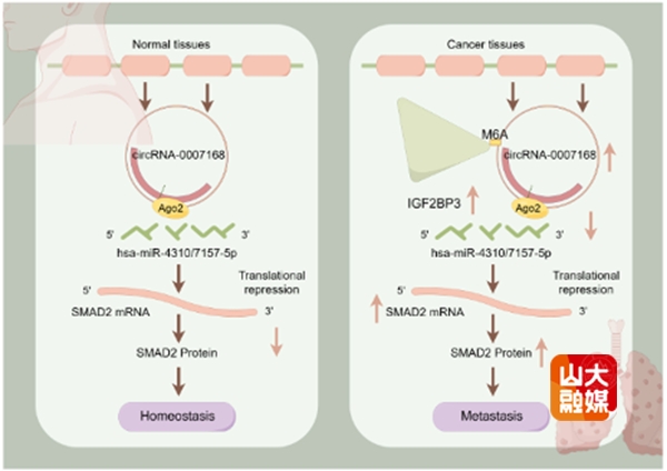 雷大鹏教授团队围绕这一科学问题展开了系统且深入的研究。研究发现,m⁶A识别蛋白IGF2BP3在头颈鳞癌组织中高表达,且其高表达与患者不良临床结局显著相关,是头颈鳞癌患者预后的独立危险因素。机制研究表明,IGF2BP3可直接与circHECTD2结合并维持其稳定性,而circHECTD2的m⁶A修饰能够显著增强二者的结合作用,这一过程是调控后续信号通路的关键。进一步研究证实,circHECTD2作为竞争性内源RNA(ceRNA),可通过吸附hsa_miR_4310和hsa-miR-7157-5p,抑制其对下游靶基因SMAD2 mRNA的降解作用,进而上调 SMAD2的表达。最终,IGF2BP3/circHECTD2/SMAD2这一调控轴通过促进头颈鳞癌细胞的增殖、侵袭和转移,推动肿瘤的恶性进展。