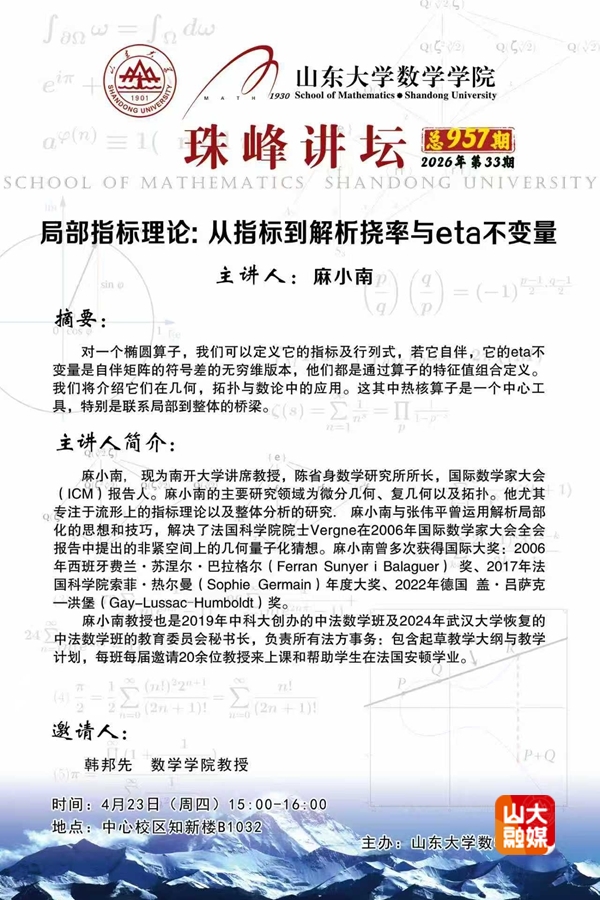 数学学院珠峰讲坛第957期 | 局部指标理论: 从指标到解析挠率与eta不变量
