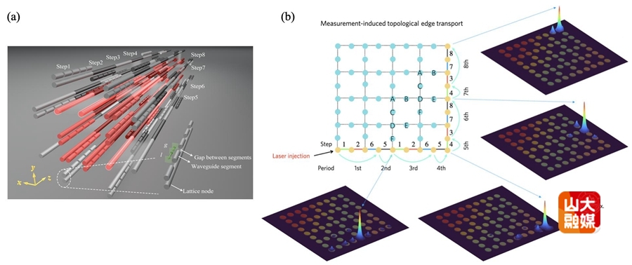 图:测量诱导的光子拓扑绝缘体。 (a) 片上集成的光波导结构图,(b)测量诱导的拓扑边界传输。
