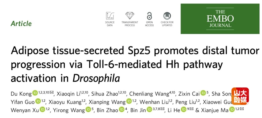 [本站讯]近日,山东大学齐鲁第二医院靳斌教授团队与西湖大学马仙珏教授团队在欧洲分子生物学学会(EMBO)的旗舰期刊The EMBO Journal(中科院1区TOP期刊,5年平均IF:10.6)在线发表了最新研究成果“Adipose tissue-secreted Spz5 promotes distal tumor progression via Toll-6-mediated Hh pathway activation in Drosophila”。该研究揭示了脂肪组织分泌的关键因子Spz5通过激活Toll-6受体-Hedgehog(Hh)信号轴,驱动远端上皮肿瘤恶性进展的分子机制,并发现了肿瘤与脂肪之间的双向正反馈环路,为脂肪组织通过器官间通讯调控肿瘤进展的复杂机制提供了新见解。