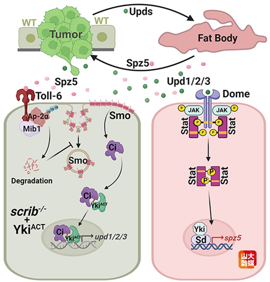 尽管大量流行病学证据表明肥胖与癌症风险增加之间存在明显的联系,但脂肪组织调控肿瘤发生的潜在机制仍不清楚。在该研究中,研究团队通过整合多种不同的基因表达系统,构建了在脂肪组织和上皮肿瘤内同时进行基因操控的体内遗传模型。在此基础上,团队通过大规模体内遗传学筛选,鉴定出脂肪组织分泌的关键信号分子Spz5可通过体液循环到达远端肿瘤,与肿瘤细胞表面的Toll-6受体特异性结合,进而通过Mib1介导的泛素化促进内吞衔接蛋白AP-2α的降解。内吞作用受损导致细胞膜上的Smo积累,随后激活Hedgehog(Hh)信号通路。这种异常的Hh激活与致癌的Yorkie(Yki)协同作用,最终驱动肿瘤的生长和侵袭。此外,研究团队还发现肿瘤来源的配体(Upds)可通过体液循环激活脂肪组织中的JAK-STAT通路,促进Hippo通路依赖的spz5表达,进而形成脂肪和肿瘤之间的双向反馈环路。综上,该研究通过创新的肿瘤遗传模型,多层次解析了脂肪组织和肿瘤器官间通讯的双向调控机制,为肥胖相关癌症研究提供了理论支持。