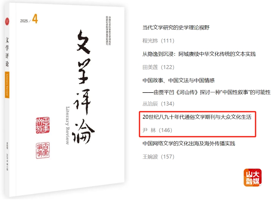 [本站讯]《文学评论》2025年第4期刊发了文学院研究员尹林撰写的学术论文,题为《20世纪八九十年代通俗文学期刊与大众文化生活》(起止页码:146-156)。