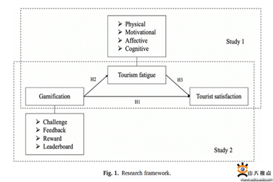 在游戏化体验组中,常见的游戏化元素,包括挑战(任务)、奖励(积分、奖励)、反馈和故事情节等被整合到虚拟旅游体验中。在非游戏化组中,参与者仅在四个VR旅游场景中进行观光性游览。研究结果表明,游客对基于游戏化的VR旅游体验满意度高于非游戏化的VR旅游体验满意度,且动机疲劳在游戏化与旅游满意度之间起中介作用。