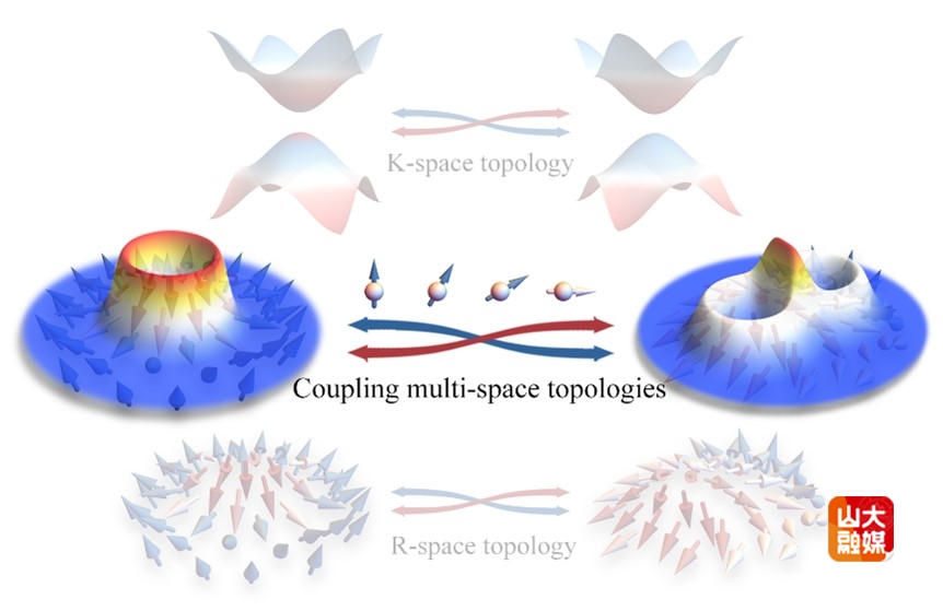 进展三:在凝聚态物理中,拓扑可同时存在于实空间与动量空间。动量空间拓扑的典型代表之一是能带拓扑,例如量子反常霍尔效应,其特征为非零量子化的动量空间几何相位,由陈数C表征,该拓扑不变量保证了手性边缘态的存在,可以实现无耗散的电流输运,为低功耗存储与逻辑器件奠定了基础。实空间拓扑则表现为磁斯格明子、磁双半子等拓扑磁,其非零量子化的拓扑荷Q不仅赋予这类自旋花纹拓扑稳定性,更使其在外场作用下呈现准粒子特性,成为高性能自旋电子器件的理想信息载体。理论上,这两个存在于不同空间的拓扑在二维磁体中可实现共存与耦合。这种多空间拓扑机制不仅能改变材料的本身性质,更为连接实/动量空间拓扑物理搭建了桥梁,具有重要基础价值与应用潜力。然而受限于不同空间拓扑共存体系的稀缺性,多空间拓扑耦合机制至今尚未获得清晰的理论阐释。基于第一性原理计算和蒙特卡洛模拟,该团队在二维铁磁晶格中发现拓扑磁与能带拓扑相互作用诱导的多空间拓扑效应。基于连续介质理论与紧束缚模型,揭示了磁斯格明子/磁双半子与量子反常霍尔效应间的关联会产生局域的手性束缚态。通过磁场调控拓扑磁,可实现伴随不同手性束缚态的多空间拓扑切换,并伴有手性束缚态空间分布的变化。通过第一性原理计算与原子自旋级模拟,该团队证明了单层Cr2NSb中存在着强耦合的多空间拓扑。该发现不仅拓展了拓扑物理的研究维度,更为二维晶格体系的多空间拓扑调控开辟了新路径。相关研究成果以“Coupling Multi-Space Topologies in 2D Ferromagnetic Lattice”为题发表在Adv. Funct. Mater.国际期刊上。论文第一作者为2022级博士生何仲麟,马衍东教授和戴瑛教授为共同通讯作者,山东大学为唯一作者单位。