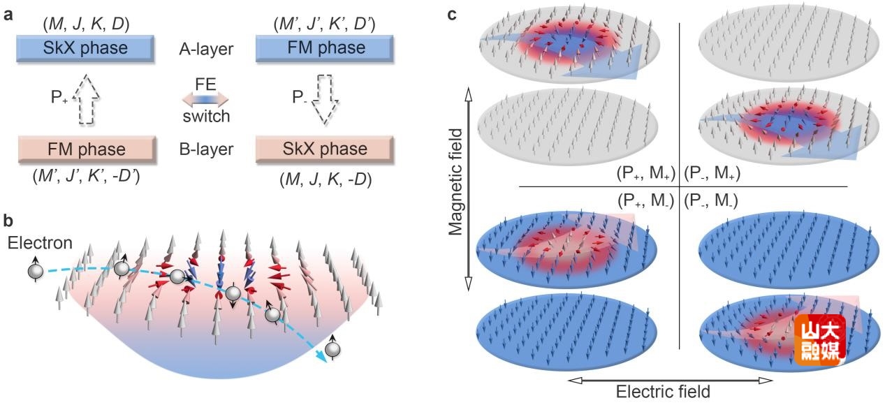 进展一:层霍尔效应,源于层自由度和贝里曲率的耦合,在基础研究和器件应用方面具有重要意义。目前,所有关于层霍尔效应的研究都植根于动量空间贝里相的范式,这必然需要满足苛刻的能带条件,对层霍尔效应的发展带来了显著挑战。基于此,团队提出了一种在二维I型多铁异质结中耦合磁斯格明子与层自由度的物理机制,进而提出了拓扑层霍尔效应的概念。与传统依赖于动量空间贝里相的层霍尔效应不同,拓扑层霍尔效应与层锁定的非共面自旋纹理(磁斯格明子)产生的实空间贝里物理有关。由于磁电耦合效应的存在,拓扑层霍尔效应可以通过铁电性和磁性进行有效控制。进一步地,该物理机制的可行性在二维多铁异质结CrInSe3/In2S3/CrInSe3中得到了验证。该团队的这一发现丰富了磁斯格明子和层霍尔效应的研究。相关研究成果以“Topological layer Hall effect in two-dimensional type-I multiferroic Heterostructure”为题发表在国际期刊Nature Commun.期刊上。论文第一作者为物理学院2024届博士毕业生杜文惠,马衍东教授、戴瑛教授和晶体材料研究院的王泽岩教授为共同通讯作者,山东大学为唯一作者单位。