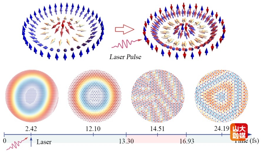 进展四:光-自旋耦合效应作为基础物理研究与器件应用领域备受关注的重要现象,近年来发展迅速。然而。目前相关研究主要集中在传统磁性体系中,而光与拓扑磁性之间的相互作用机制尚不明晰。本文结合第一性原理计算、实时时间依赖密度泛函理论(rt-TDDFT)以及原子自旋动力学模拟,系统研究了单层CrInSe3在激光脉冲作用下拓扑自旋特性的演化规律,首次实现了铁磁-反铁磁斯格明子的超快反转。理论研究表明,该物理过程源于激光诱导的自旋选择性电荷转移、显著退磁效应以及随时间演化的磁相互作用。特别值得关注的是,光激发可导致体系发生铁磁-反铁磁交换作用的转变,而动力学分析进一步揭示,该过程伴随着拓扑磁性从铁磁型到反铁磁型斯格明子的相变演化,展现出光场与拓扑磁性之间新颖的相互作用机制。本研究为拓扑磁性的超快调控提供了全新的技术路径。相关研究成果以“Ultrafast laser driven ferromagnetic-antiferromagnetic skyrmion switching in 2D topological magnet”为题发表在Small国际期刊上。论文第一作者为2023级博士生窦恺莹,马衍东教授和戴瑛教授为共同通讯作者,山东大学为唯一作者单位。