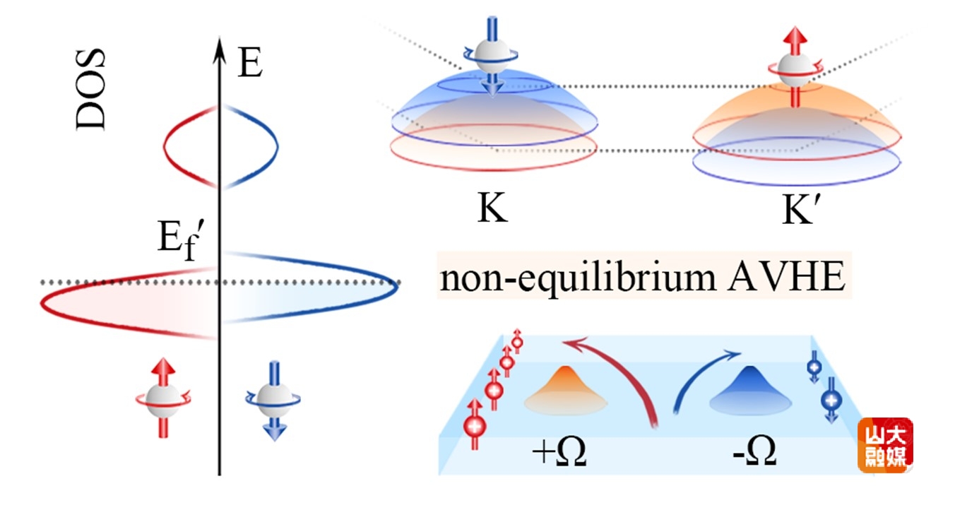 进展六:二维材料体系中能谷自由度的量子调控在凝聚态物理与量子信息科学领域具有基础性研究价值。当前该领域研究主要聚焦于时间反演对称性破缺的磁性二维体系。针对这一理论局限,本研究创新性地提出利用范霍夫奇点(vHS)的电子不稳定性,通过空穴掺杂在非磁性体系中诱导时间反演对称性破缺,成功将能谷效应拓展至二维非磁性体系。理论预测发现该机制会产生区别于传统反常能谷霍尔效应(AVHE)的新型量子现象,被定义为非平衡态AVHE。基于第一性原理计算,该团队在非磁性单层In2Se3铁电体中验证了这一机制,并探讨了其中的多铁性耦合。该工作突破了传统能谷物理研究的材料体系限制,为二维非磁性多铁体系中的能谷调控建立了全新研究范式。相关研究成果以“van Hove Singularity-Induced Non-Equilibrium Anomalous Valley Hall Effect in a Two-Dimensional Lattice”为题发表在Nano Lett.国际期刊上。论文第一作者为2023级硕士生柴树妍,马衍东教授、戴瑛教授以及李新茹老师为共同通讯作者,山东大学为唯一作者单位。