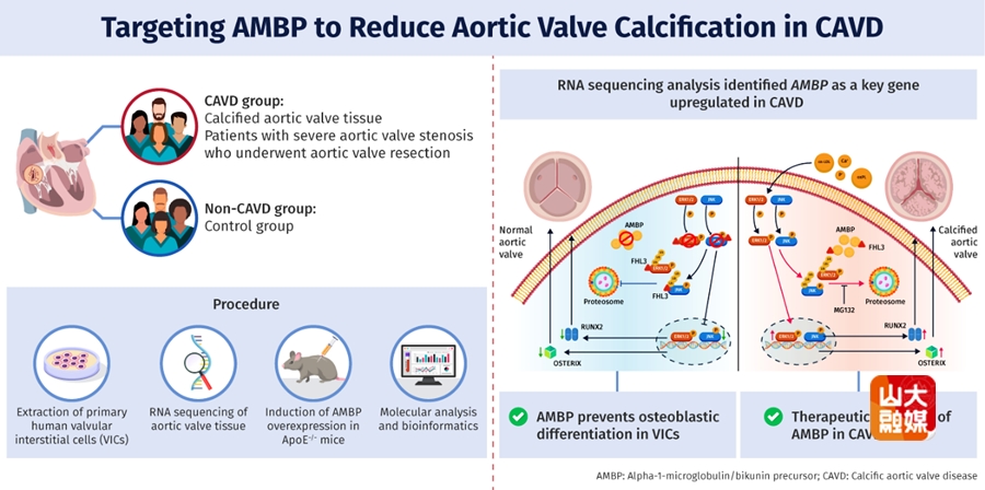 山东大学齐鲁医院全国重点实验室教授安贵鹏、张澄团队研究发现,在人和小鼠钙化主动脉瓣膜组织中AMBP表达明显升高。体外实验证实,当原代瓣膜间质细胞(VIC)暴露于钙化诱导培养基(OM)构建的病理微环境时,AMBP表达水平呈显著上调趋势。继之,课题组开展了功能实验,发现在高胆固醇饮食(HCD)诱导的ApoE-/-小鼠主动脉瓣钙化模型中,AMBP过表达显著降低了小鼠的瓣膜厚度、纤维化程度和钙化面积,改善了主动脉瓣血流动力学指标。体外实验进一步证实,AMBP过表达可显著降低VIC中OM诱导的钙化标志物(RUNX2、OSTERIX)的表达并减少钙结节沉积,而使用siRNAs靶向敲低AMBP则可逆转这一作用。为了阐明AMBP抑制主动脉瓣钙化的分子机制,课题组对上调的差异表达基因进行了KEGG及GSEA富集分析,发现MAPK通路在CAVD中显著激活。体外实验显示,OM暴露显著诱导了VIC中MAPK通路关键蛋白—ERK1/2和JNK磷酸化,敲低AMBP可进一步加剧二者的磷酸化。课题组采用泛素-蛋白酶体抑制实验、分子互作模拟、免疫共沉淀,截短体突变及MAPK通路抑制等实验方法,发现AMBP可竞争性结合FHL3的锌指结构域,这种互作阻断了FHL3对P-ERK1/2和P-JNK的保护作用,进而促进P-ERK1/2和P-JNK泛素-蛋白酶体降解。体外实验发现,ERK/JNK抑制剂可逆转AMBP敲低诱导的VIC成骨分化。最后,课题组通过体内实验发现,使用ERK激动剂和JNK激动剂预处理可部分抵消AMBP过表达对小鼠瓣膜钙化的保护作用,证实AMBP通过MAPK通路而发挥作用。综上所述,该研究首次发现AMBP调控CAVD的重要作用和分子机制,为CAVD的防治提供了新的思路和靶点。该研究发表于Theranostics杂志,安贵鹏教授、张澄教授为本文的共同通讯作者,山东大学齐鲁医院博士后郭成虎、副教授刘晓玲为该文的共同第一作者,山东大学齐鲁医院为该文的第一和通讯作者单位。