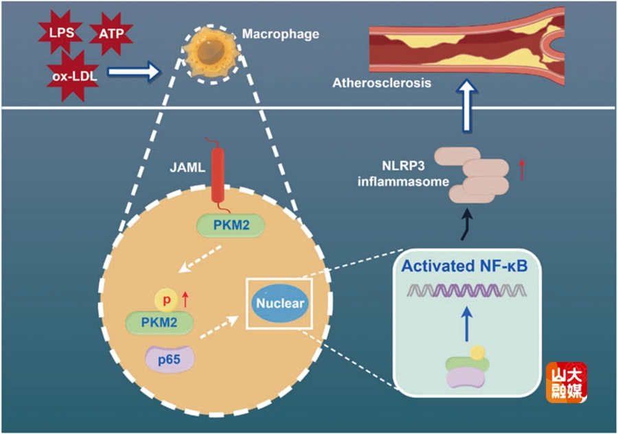 连接粘附分子样蛋白(JAML)是一种I型跨膜糖蛋白,介导细胞间的相互作用并与细胞内蛋白结合,进而激活下游信号通路。然而,巨噬细胞JAML在NLRP3炎症小体激活和AS发病中的作用尚不明了。齐鲁医院全国重点实验室教授杨建民、张文程团队首先分析了以往人颈动脉粥样硬化数据集,发现人AS化斑块中JAML表达的显著上调。继之,课题组构建了AS小鼠模型,发现小鼠斑块中JAML的表达显著增加,尤其在巨噬细胞中高表达。进一步研究发现,JAML在冠心病患者的人外周血单核细胞(PBMCs)和人单核细胞源性巨噬细胞(HMDMs)中的表达均显著升高。为了明确JAML在AS发生和发展中的作用,课题组构建了巨噬细胞特异性敲除和过表达JAML合并AS的小鼠模型。结果显示,巨噬细胞特异性敲除JAML可抑制小鼠AS的发展,反之,过表达JAML可促进AS的进展。深入的机制研究显示,JAML通过调节PKM2的磷酸化和核移位激活NF-κB信号通路,导致NLRP3炎症小体激活,刺激促炎因子分泌,最终加速AS的进展。这些发现首次揭示了巨噬细胞JAML在AS中的重要作用,为AS的抗炎治疗提供了潜在的新靶点。该研究发表于Cell Death and Differentiation,杨建民教授、张文程教授为该文的共同通讯作者,山东大学齐鲁医院博士研究生崔会良、博士后谢琳和博士后吕翰林为该文的共同第一作者,山东大学齐鲁医院为该文的第一和通讯作者单位。