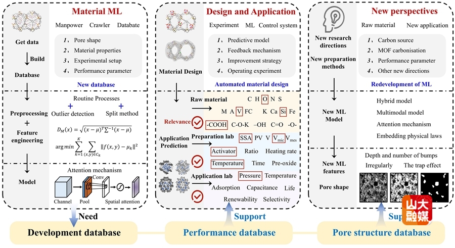 多孔碳材料在碳捕集、气体分离、储能和催化等领域展现出巨大潜力,但因碳材料的结构调控高度依赖于试验和经验的积累,需反复试错和总结,传统的试错式制备方法成本高、效率低。近年来机器学习(ML)的发展为材料科学研究带来了范式革命。ML不仅能实现性能预测,还能深度挖掘材料的复杂结构与性能之间的关系,推动材料的智能设计、优化与应用效率的提升。