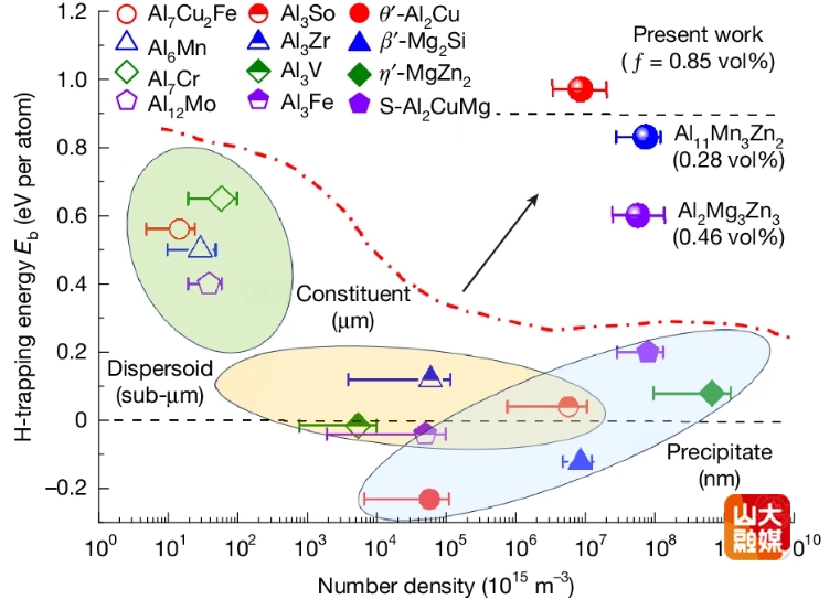 图2 铝合金中不同金属间化合物颗粒氢捕获能与其数量密度对应关系对比图