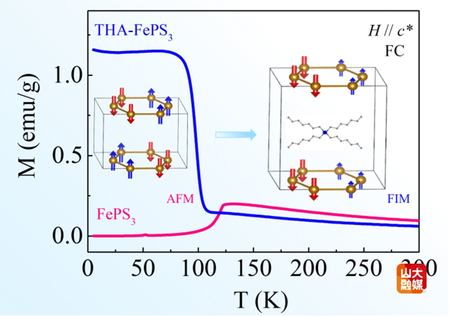 本工作利用有机阳离子插层技术,将各种类型有机阳离子插入到FePS3的范德瓦尔斯层间,利用插层离子与每层材料间的电荷转移系统地调控其中的载流子浓度,进而调控其磁性能。随着载流子浓度的增加,插层FePS3的磁基态发生反铁磁-铁磁-反铁磁转变。在适当的电子掺杂浓度下,插层FePS3表现为亚铁磁序,Tc = 110 K。特别是插层FePS3仍然保持垂直磁各向异性和较大的矫顽场。插层FePS3磁滞回线的磁能积在50 K以下随着温度的升高而增大,在50 K以上随着温度升高而减小,最终在Tc = 110 K处消失。当电子掺杂浓度进一步增加时,插层FePS3仍保持其反铁磁性质,但其奈尔温度降低。DFT的理论计算结果表明在亚铁磁态,FePS3两条反铁磁耦合的铁磁链上Fe(1)和Fe(2)的原子磁矩大小不等,产生净磁矩,且电子掺杂诱导的AFM-FIM相变是由于Stoner效应和超交换作用之间的竞争导致的。该工作为纯电学手段调控二维磁性材料磁性能以及设计新型自旋电子器件提供了新的视角。