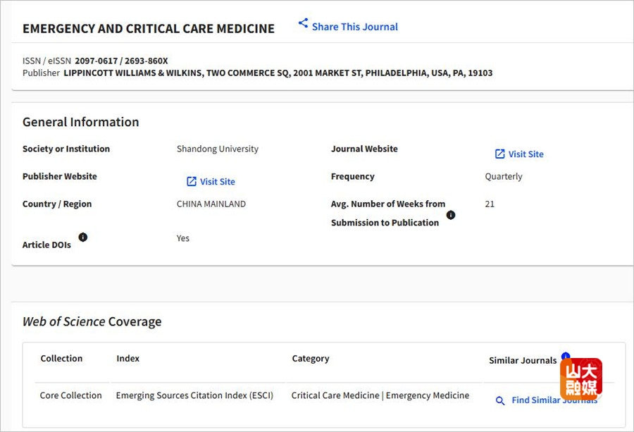 [本站讯]近日,由山东大学主办、山东大学科技期刊社与威科(Wolters Kluwer)集团合作出版、山东大学齐鲁医院承办的国际学术期刊Emergency and Critical Care Medicine(《急危重症医学(英文)》,CN 37-1533/R,ISSN 2097-0617)通过科睿唯安(Clarivate Analytics)严格评审,正式被ESCI(Emerging Source Citation Index)数据库收录,并将于2026年获得首个影响因子。