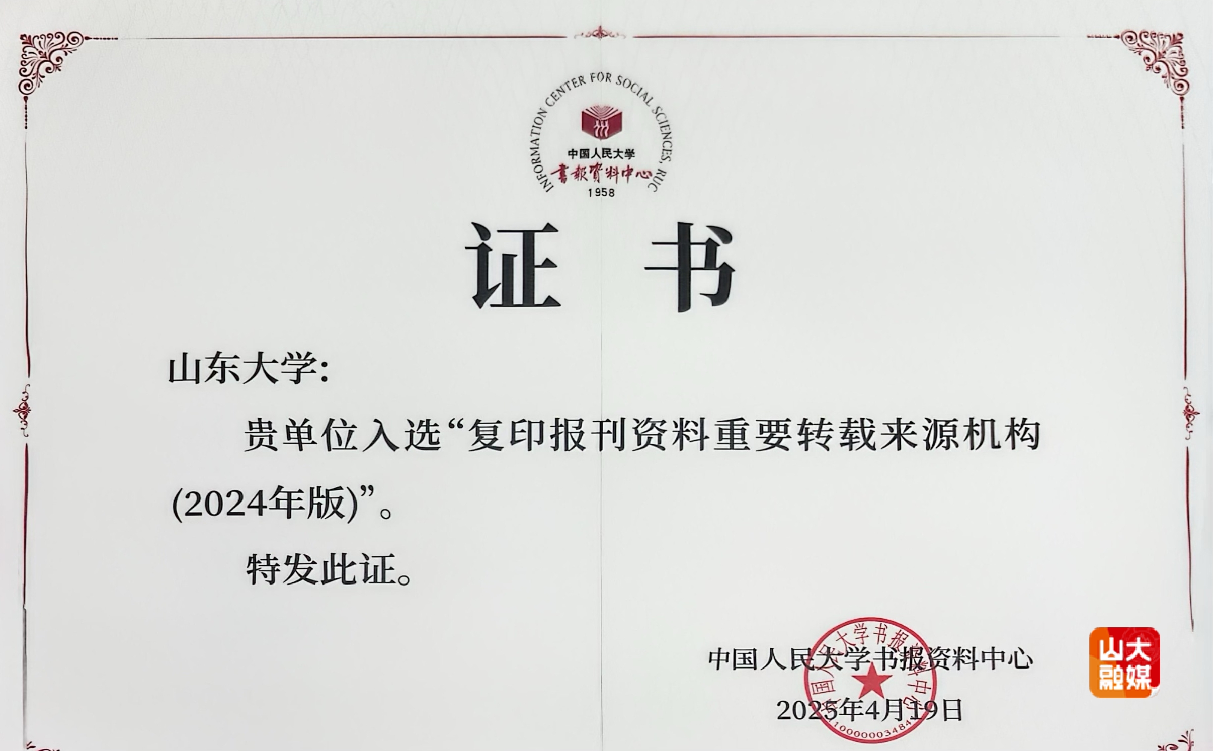 [本站讯]近日,中国人民大学书报资料中心正式发布了《复印报刊资料转载指数研究报告(2024年度)》《复印报刊资料重要转载来源机构(2024年版)》。本次共有627种学术期刊入选期刊转载指数表,人文社科期刊社《山东大学学报(哲学社会科学版)》《当代世界社会主义问题》《周易研究》等3种期刊成功入选。山东大学入选“复印报刊资料重要转载来源机构(2024年版)”。