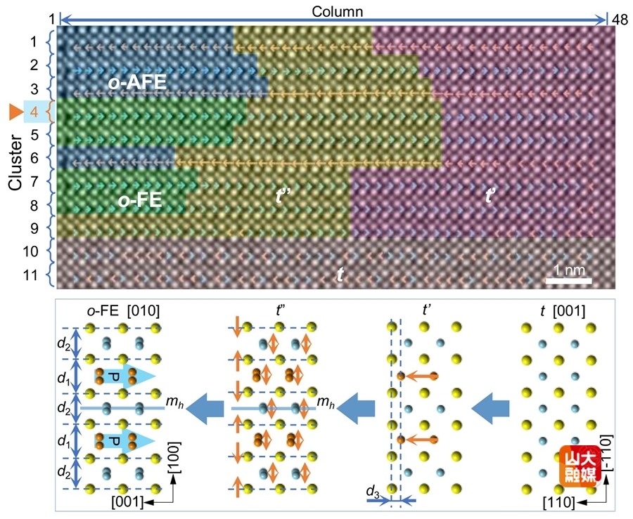 Lu:Hf1-xZrxO2体块晶体的iDPC-STEM数据与其铁电相演变机理示意图