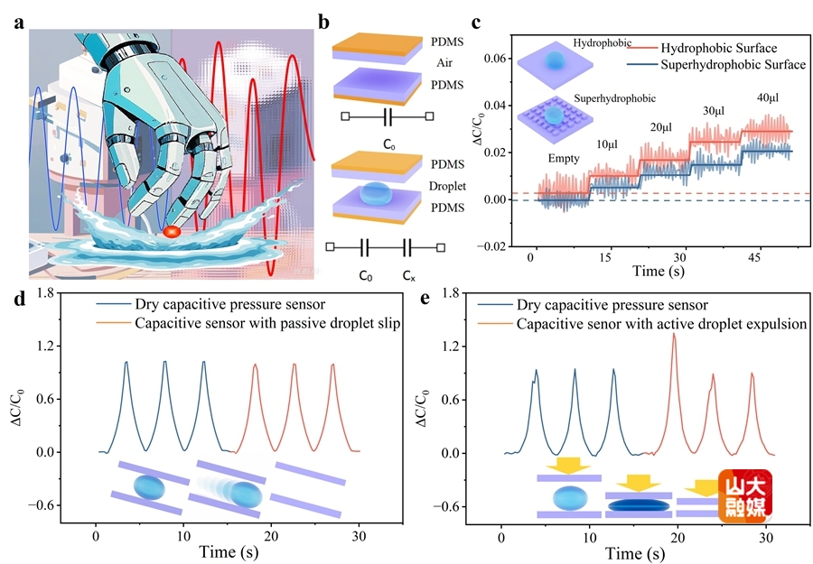 [本站讯]近日,山东大学集成电路学院/未来技术学院钱凯教授团队在柔性传感器领域取得新突破,成功开发出一种能有效解决液体干扰问题的超疏水电容传感器。相关研究成果以“Liquid Interference Mitigation in Capacitive Sensors Using Cassie-Baxter State based on Superhydrophobic Surfaces”为题,发表在国际期刊ACS Applied Electronic Materials(影响因子4.3)上。该论文第一作者为集成电路学院本科生肖易霏,共同通讯作者为集成电路学院卓优博士后戴子忆,山东大学集成电路学院为第一完成单位。