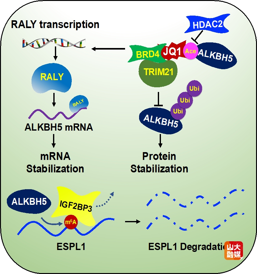 另外,基础所助理研究员卢琳琳为共同第一作者,与中山大学药学院团队合作,于1月3日在Acta Pharmaceutica Sinica B(1区,影响因子14.8)上,发表了题为“BRD4 regulates m6A of ESPL1 mRNA via interaction with ALKBH5 to modulate breast cancer progression”的研究成果。基于溴结构域蛋白家族的BRD4在乳腺癌进展中的作用,发现抑制BRD4的活性能够显著降低乳腺癌细胞mRNA的m6A甲基化水平,并抑制其恶性程度,而此过程与上调去甲基化酶AlkB同源蛋白5(ALKBH5)相关,BRD4降低ALKBH5 mRNA 的稳定性,主要是通过抑制其 3′非翻译区(3UTR)与RNA结合蛋白RALY之间的结合实现的。此外,BRD4作为泛素酶TRIM21和ALKBH5结合的支架,促进ALKBH5蛋白的泛素化降解。动物和临床研究进一步证实了BRD4/ALKBH5/ESPL1通路在乳腺癌进展中的关键作用,该研究为理解组蛋白修饰与RNA甲基化之间的相互作用提供了新的视角,也为乳腺癌治疗提供了潜在的新靶点。