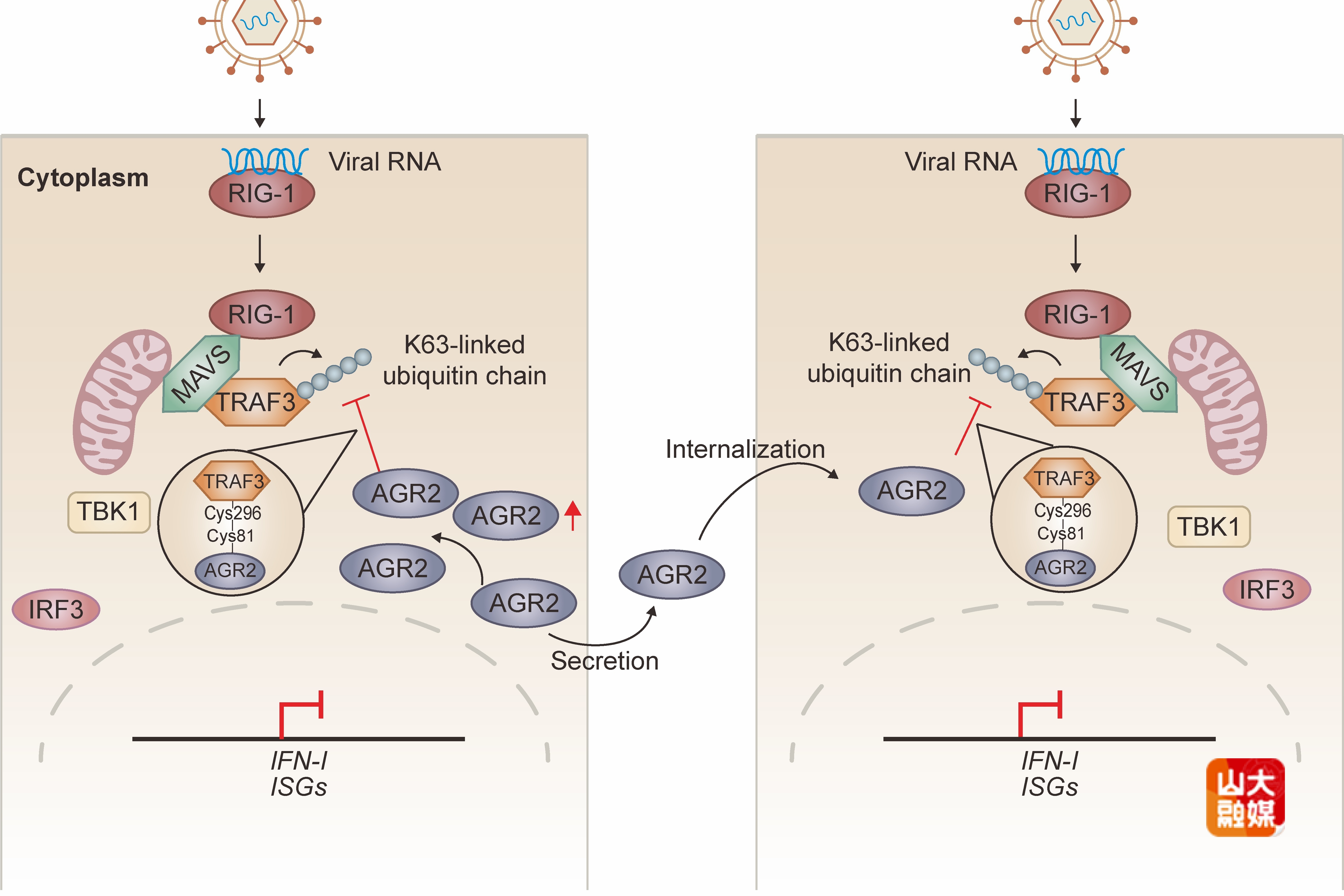 3月3日,基础医学研究所在Redox Biology(1区,影响因子10.7)上,发表了题为“AGR2-mediated cell-cell communication controls the antiviral immune response by promoting the thiol oxidation of TRAF3”的研究成果,贾梦琪为文章的独立第一作者,苑辉卿教授为独立通讯作者,山东大学第二医院为唯一通讯单位。该研究揭示了PDI成员AGR2在抗病毒免疫中的新功能。研究人员通过数据库分析和通量筛选发现,在RNA病毒感染的肺上皮细胞中,PDI家族成员AGR2的表达和分泌显著增加,通过AGR2全身敲除、过表达小鼠模型以及体外实验,证实AGR2负调控I型干扰素(IFN-I)的产生。尽管AGR2在免疫细胞中缺失,但上皮细胞分泌的AGR2能够通过内吞作用进入免疫细胞,抑制抗病毒固有免疫信号转导。通过对信号通路节点蛋白分子的筛选,确定TRAF3是AGR2新的互作蛋白。AGR2通过其半胱氨酸氧化修饰TRAF3的296位半胱氨酸残基,从而阻碍TRAF3的K63连接泛素化以及TRAF3-TBK1复合物的形成,最终抑制TRAF3诱导的抗病毒固有免疫反应。该研究揭示了半胱氨酸依赖的氧化修饰维持固有免疫稳态的分子机制,明确了AGR2是一种新的抗病毒固有免疫信号转导抑制分子。该研究为病毒感染、自身免疫性疾病的诊治提供了新的思路。