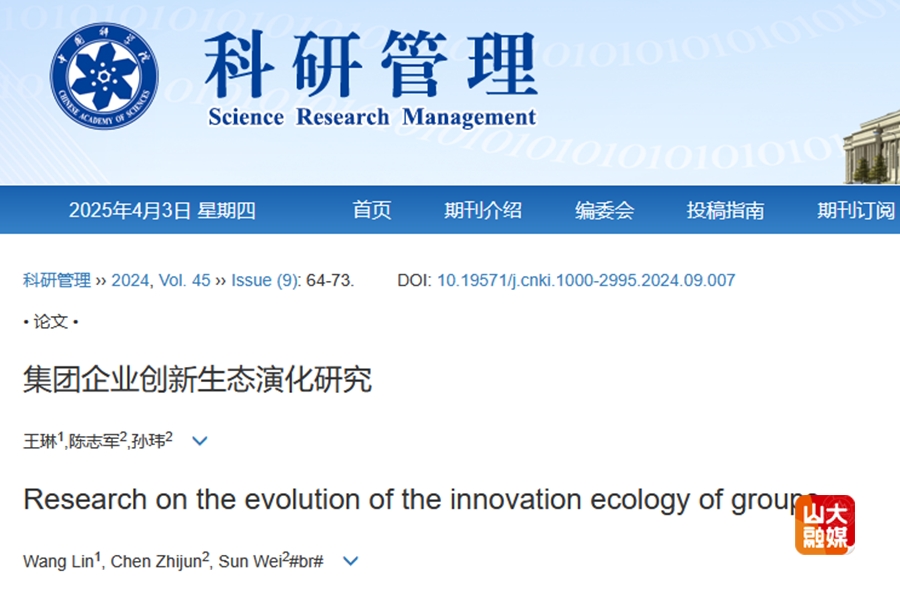 “集团企业创新生态演化研究”以海信集团公司为创新生态设计者对集团创新生态演化进行了探索性单案例研究,提炼了不同发展阶段创新生态构建过程及演化逻辑模型。王琳副教授是第一作者,第二作者是博士生孙玮,陈志军教授是通讯作者。研究成果在《科研管理》2024年第9期正式发表。《科研管理》是国内管理学领域重要期刊、国家自然科学基金委A类期刊,2024年复合影响因子为7.711。
