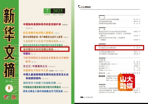 [本站讯]近日,历史学院教授马新的研究论文《论中国古代乡村治理之得失》被《新华文摘》2025年第7期主体转载,并列入封面要目。